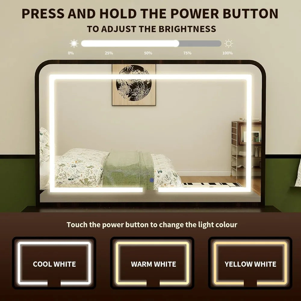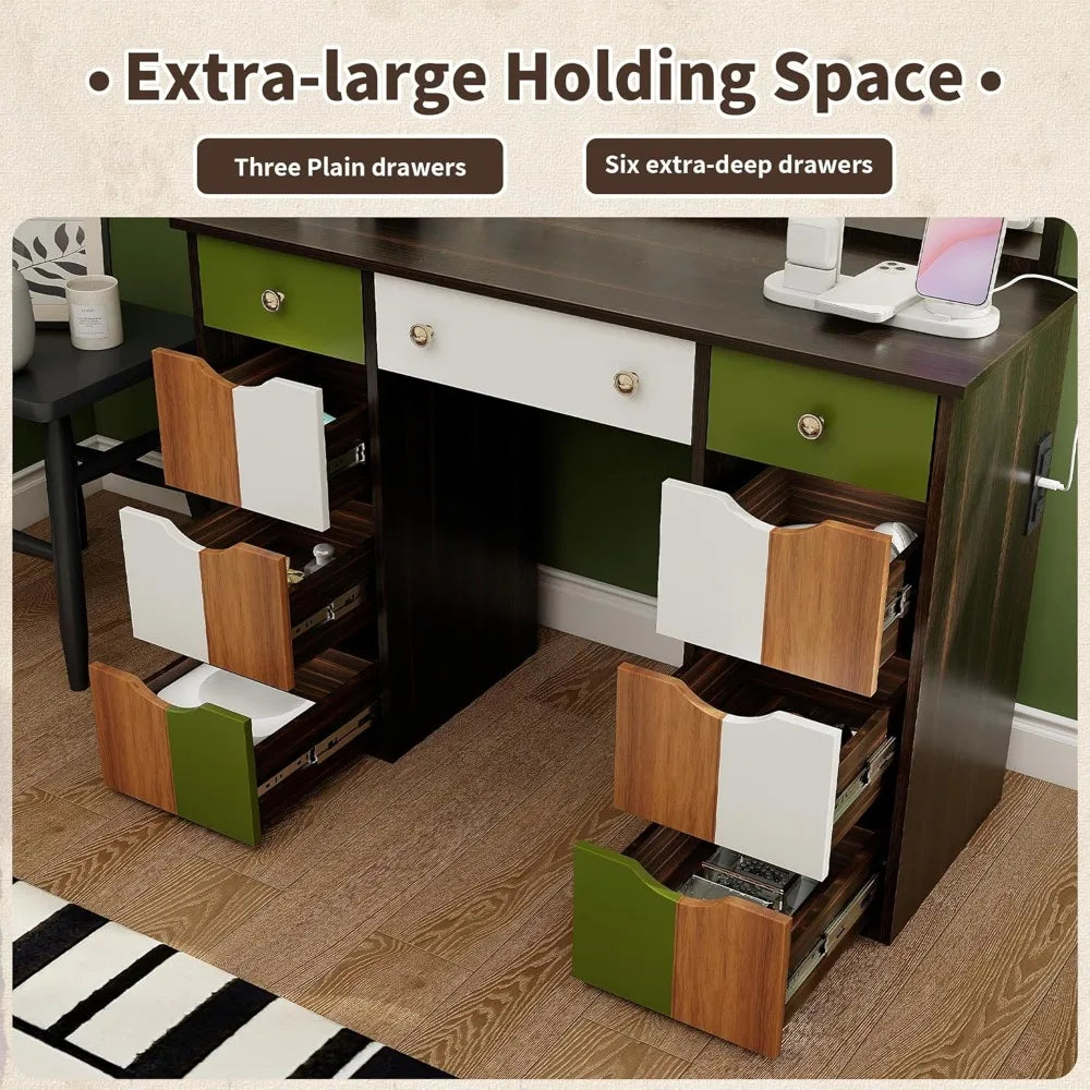 Vanity Desk with Power Outlet, LED Lights, & 9 Drawers